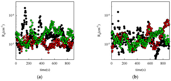 Time dependence of Rθ for suspensions of latex particles (d = 0.5 µm) at C = 10−4 ((a), triangles), 10−5 ((b), squares), and 10−6 ((c), diamonds) g/L at q = 3.9 × 106 m−1 (θ = 17°). The red, green and black colors represent three independent measurements for each concentration.