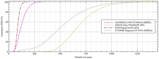 Three of these plastics—HDPE, PP and PS—were properly described in the preliminary publication of these authors [14]. Particle density, size distribution and the PMMA shape were determined following the same instructions presented in that previous study. Other basic information was taken from technical information reports and data sheets provided by the manufacturers. All the characteristics for PMMA are presented in Table 1. The particle size distribution of all four investigated plastics is stated in Figure 1.