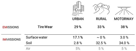 Emissions are the tire wear particles generated and emitted on the vehicle and are transported into the environmental compartments air, soil and water, where they are described as immissions. Basically, measures can be divided into two groups. They can either focus on emissions and reduce the general generation of tire wear or on immissions and remove the emitted tire wear. For the efficient use of measures, it is therefore of interest to know where tire wear occurs and which input path leads into the environment.