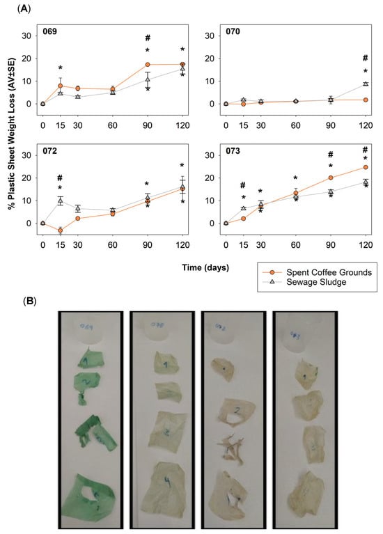 (A) Degradation of the 4 types of plastic films in vermicomposting systems, represented as % weight loss. Significant differences compared with the initial timepoint (T = 0) are indicated by *, while differences between vermicomposting systems are identified by #. (B) Visual appearance of sheets from each of the 4 types of plastics sampled after 120 days in a vermicomposting system with sewage sludge, post-washing and drying steps, from left to right: 069, 070, 072 and 073.