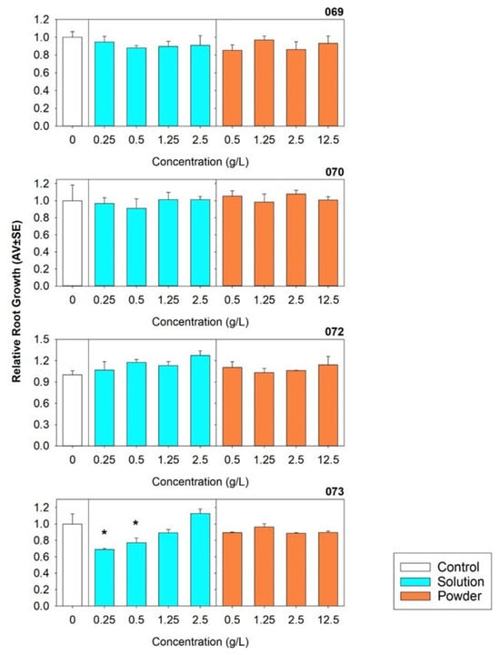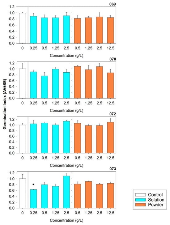 The L. sativum seedling test fulfilled the performance criteria outlined in the ISO guidelines, with percentage germination reaching 81.2 ± 0.8% (mean ± standard error) after 7 days under control conditions and the root length control reaching 60.4 ± 1.5 mm (mean ± standard error) in the control replicates. The results contradict the hypothesis that the degradation of compostable plastic could lead to the release of toxic compounds to plants. No overall effect on seedling emergence after 7 days was observed when the L. sativum seeds were exposed to either powdered microplastics (<250 µm) or leachates from the four types of plastic bags, even at a concentration of 12.5 g/L. No significant differences in RSG were observed after 7 days (Figure S2). However, a significant decrease (p < 0.05) in RRG was observed for exposure to 0.25 and 0.5 g/L of bag 073 as leachate (Figure 2) and a significant decrease in GI was observed for the same material at 0.25 mg/L (Figure 3) (detailed information in Table S4). Regarding RRG, there was a positive tendency with the increase in concentration from 0.25 to 2.5 g/L, while the GI values for higher concentrations (2.5 g/L) were as high as the control.