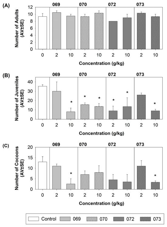 As expected, the survival of E. andrei adults was not affected after 28 days. However, after 56 days, there was a significant decrease in the numbers of juveniles and cocoons produced (p < 0.05) relative to the controls (detailed information in Table S5). For the exposure to the highest concentration of fragments for all plastics, the number of juveniles produced was significantly lower than in the controls. This was also observed for exposure to bags 070 and 072 at a concentration of 2 g/kg. The number of cocoons produced was also significantly lower for exposure to bags 069 and 073 at a concentration of 10 g/kg (Figure 4).