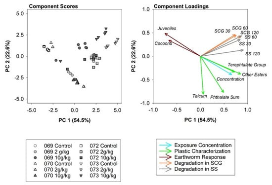 Principal component analysis (PCA) was used to correlate E. andrei toxicity data and plastic degradation data and identify key factors to explain the toxic effects on the organisms. All analyses were performed by using SigmaPlot, version 14.0.