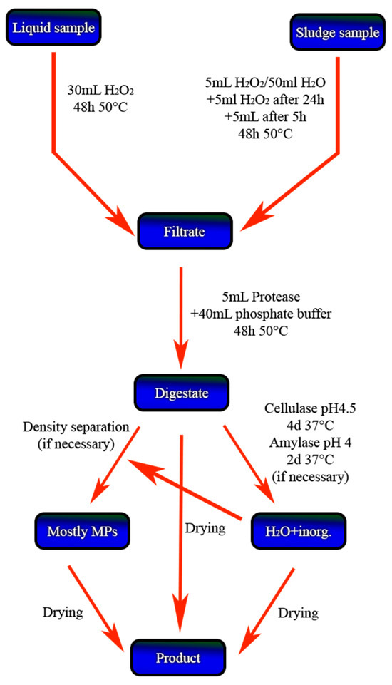 The obtained liquid (non-sludge) samples were filtered through a 20 µm steel filter (G. BOPP + CO. AG, Zurich, Switzerland). These filters were used for the entire digestion process. For each sample, 1–3 L of the sample was filtered, depending on the amount of sediment to test the enzyme efficiency. Initially, subsampling was performed by splitting the same bottle into three samples of 2 × 350 mL and 1 × 300 mL. Once the method was further optimized, the bottles were filtered in their entirety. These filtered samples and sludges/digestates were subjected to an enzymatic digestion process based on the protocol reported by Löder et al. [24]. The protocol was modified to adapt to the different matrices of industrial samples (see Figure 1). In detail, firstly, 30 mL of 35% H2O2 (Merck, Rahway, NJ, USA) was added to the sample and shaken at 50 °C and 100 RPM for 2 days. Then, the hydrogen peroxide was filtered away and 5 mL of protease (Protease A-01, ASA Spezialenzyme GmbH, Wolfenbüttel, Germany) was combined with 25 mL of pH 9 phosphate saline buffer (pH 7.4, Sigma-Aldrich, St. Louis, MI, USA), added to the sample and left at 100 RPM and 50 °C for 2 days again. If further enzymes were necessary, after filtering out the protease solution, 10 mL of cellulase (Cellulase TXL, ASA Spezialenzyme, Wolfenbüttel, Germany) in 25 mL of buffer was added and stirred at 100 RPM and 50 °C for 4 days. The cellulase solution was filtered and then 10 mL of Amylase (Amylase FL, ASA Spezialenzyme GmbH) in 25 mL of phosphate buffer was added and left stirring at 100 RPM and 37 °C for 3 days. Cellulase and amylase were tested at pH 4–7 in increments of 0.5 in phosphate buffer. The pH value of the phosphate buffer was regulated using drops of 1 M HCl (prepared from 37% HCl supplied by VWR Chemicals, Radnor, PA, USA) and 1 M NaOH solutions (prepared from NaOH pellets supplied by Millipore Sigma, St. Louis, MI, USA). Multiple enzymes were not used at the same time. Before a new enzyme was added, the previous one was always filtered away using steel filters. If there was still plenty of solid material left after the enzymatic digestion steps, density separation using sodium polytungstate (ρ = 3 g/cm3) was utilized to remove any heavy inorganics. Density separation was performed by letting the material settle in the sodium polytungstate solution for 2 days, removing the sediment and filtering the remaining solution through 20 µm steel filters.