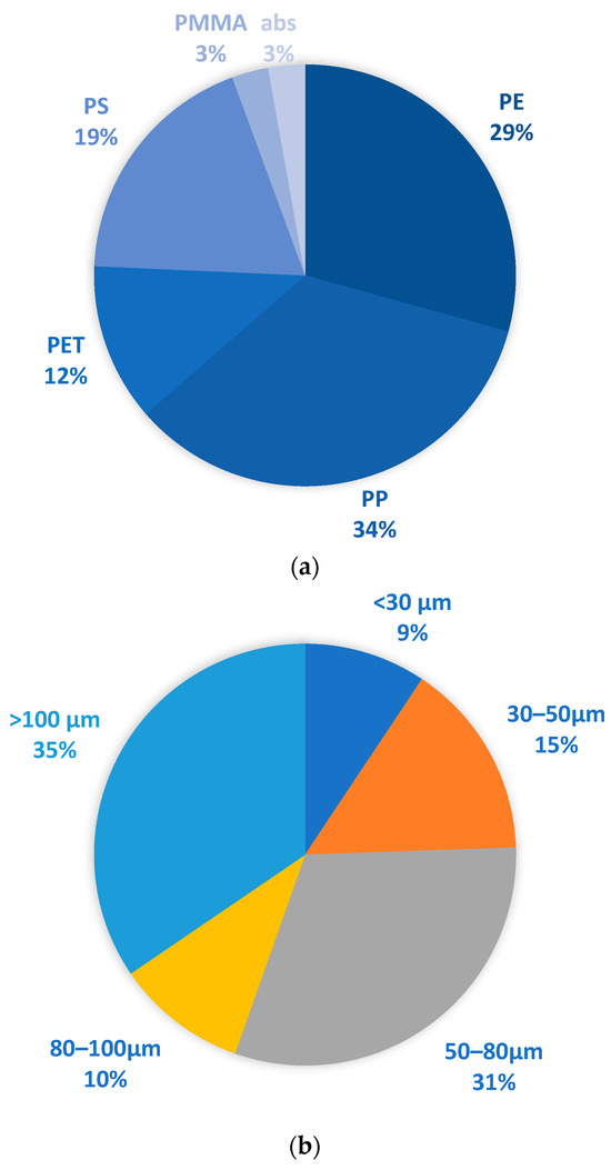 (a) Plastic types and (b) sizes of the detected plastic particles. The figure presents the size range section in Table 1 split by size category as outlined in Section 2.6.