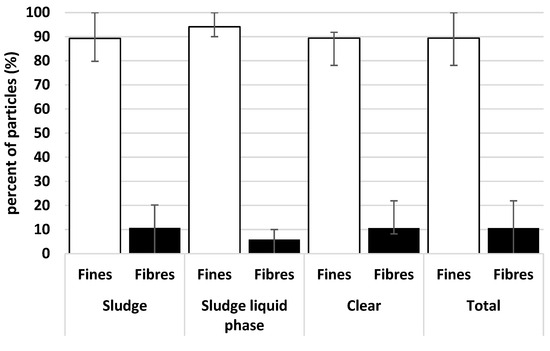 The shape of the MPs in the sludge samples differed from that in the liquid samples only slightly; however, while the MP fibre content in the sludge samples was low, several other fibres of a non-plastic origin could be observed. A comparison of the shape distribution of MPs across the different samples is shown in Figure 4. It seems that MP fibres were present in 5–10% of the detected particles. Currently, determining the fibre content depends highly on manual corrections and revisions of the SiMPle results to ensure their accuracy, as outlined in our previous work [44]. If a particle is partially covered by non-plastic material, or a long fibre is bent upwards out of focus, the software detects it as two or more particles, and manual corrections such as overlaying the microscope image with the MP map from SiMPle (shown in Appendix C, Figure A2) are needed to account for such errors.