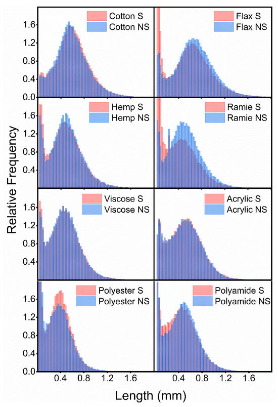 Probe sonication of microfiber samples increased the fiber count for the majority of examined microfibers, as in Table 3. In a previous study, sonication of cotton micronaire standards increased the fiber counts detected by the FQA; however, sonication of the rayon standard used to calibrate the instrument did not impact fiber counts [1]. Following the trend observed in the previous study, sonication increased the fiber counts detected for the cotton microfibers by 101% to 15,599 ± 676. Notably, the biggest increase in fiber count following sonication was observed in the hemp microfibers, with a 248% increase to 8052 ± 438 fibers. The remaining cellulosic microfibers only saw modest or insignificant increases in fiber counts; flax and viscose saw a 13 and 11% increase, respectively, while the ramie fiber count changed by two microfiber counts. Of the synthetic microfibers, polyester showed the greatest fiber count increase following sonication, with a 73% increase to 3609 ± 576, while polyamide showed an 26% increase in fiber counts. Probe sonication did not significantly alter the length averages for most of the microfibers. Indeed, relative distribution plots for each of the eight microfiber samples before and following sonication show overlapping distributions for most microfiber types, as in Figure 2. Three significant deviations are observed. First, the flax and ramie samples show marked increases in very short microfibers counts following sonication, and second, the polyester sample showed a slight increase in relative counts for fibers about 0.4 mm or longer. Statistical analysis of the length determinations showed that only sonicated samples of flax and hemp had statistically shorter fibers, both Ln and LW values, than their non-sonicated counterparts. Additional analysis is needed to determine if this reduction in length and increase in fiber counts for flax and ramie results from the natural variability of the samples, or from damage from the sonication step. Still, the decrease in mean lengths is relatively small, with a ~7% decrease in length for the Ln value of flax. The increase in mid-range microfibers for polyester likely points to the better suspension and detection of these microfiber following sonication. Taken together, these results strongly support the addition of a sonication step to the sample preparation of microfibers prior to examination with the FQA system.