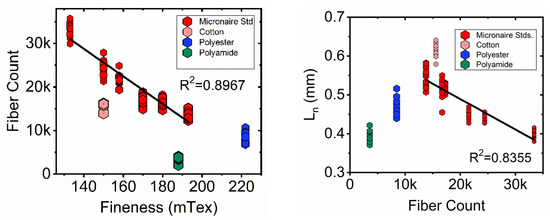 Bivariate plots of fiber counts values versus fineness (AFIS) and Ln versus fiber count. The bivariate plot of fiber counts versus fineness (left) includes values for six cotton standards from a previous study [1], and those of cotton, polyester, and polyamide from the current study. The size of each sample is proportional to its Ln value. The bivariate plot of Ln and fiber counts (right) includes the same microfiber samples. The plot size of each sample is proportional to its fineness value. A linear fit of the cotton standards (black trace) is displayed in each trace.