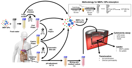 FW suspensions/solutions of MNPs alone, EPs alone, or MNPs and EPs combined were subjected to three-phase (oral, gastric, small intestinal) digestion, as previously described [38,39]. Briefly, MNP, EP, and MNP + EP solutions, as well as FW-only controls, were mixed 1:1 with pre-warmed 37 °C simulated saliva (containing mucin and various inorganic salts with a pH of 6.8) and incubated for 15 s to simulate the oral phase of digestion. The resulting digesta was then mixed 1:1 with pre-warmed 37 °C simulated gastric fluid (containing pepsin, HCl and NaCl) and incubated for 2 h in an incubator–orbital shaker at 37 °C and 200 rpm to simulate the gastric phase of digestion. The gastric digesta was then mixed with bile salts, porcine pancreatin (pancreatic extract containing amylases, proteases, lipases, etc.), and additional salts and the pH of the resulting mixture was adjusted to 7.0 by the addition of NaOH or HCl to simulate small intestinal fluid. It was incubated for 2 h in an incubator shaker at 37 °C and 200 rpm to simulate small intestinal digestion [38].