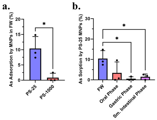 The sorption of As by PS MNPs in FW and across the GI tract. (a) The sorption of As by PS-25 and PS-1000 in FW. (b) The sorption of As by PS-25 in FW and each phase of simulated digestion. Data are shown as mean ± SD, * p < 0.05. Dots represent individual measurements.