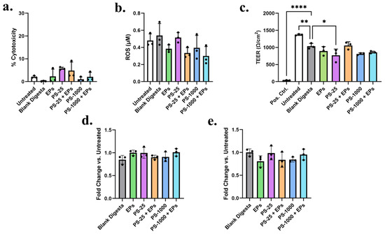 Exposure of tricultures to small intestinal digestas of EPs alone, PS-25 or PS-1000 MNPs alone, or MNPs with EPs had no significant effect on either cytotoxicity (LDH release) or oxidative stress (ROS release) relative to untreated and blank digesta controls (Figure 4a,b). Although the presence of EPs tended to reduce ROS production compared to blank, untreated, and PS-25 and PS-1000 tricultures, these differences were not statistically significant. Barrier integrity, as measured by TEER, was decreased by treatment with blank digesta compared to untreated controls (from 1372 ± 20 to 1037 ± 80 Ω/cm2, p < 0.01), but remained above 1000 Ω/cm2, indicating the existence of an intact barrier (Figure 4c). The presence of PS-25 reduced TEER slightly but significantly compared to blank digesta controls (from 1037 ± 80 to 895 ± 129 Ω/cm2, a 15% reduction, p < 0.05) (Figure 4c). PS-1000 alone, EPs alone, and EPs with PS-25 or PS-1000 had no significant effects on TEER relative to blank digesta controls (Figure 4c). Neither of the MNPs alone, EPs alone, or MNPs with EPs had any significant effect on the permeability of either 3 kDa or 70 kDa dextran (Figure 4d,e).