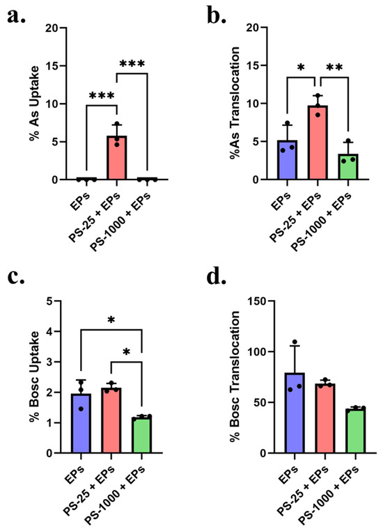 In contrast to the results from As, the presence of PS-25 had no significant effect on either the uptake or translocation of boscalid, while PS-1000 significantly reduced uptake (from 1.95 ± 0.45% to 1.18 ± 0.06%, p < 0.05) and appeared to reduce translocation (from 79.5 ± 26.3% to 43.8 ± 1.7%, p = 0.07), although this was not statistically significant (p = 0.067).