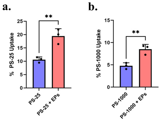 The uptake of the fluorescent PS-25 and PS-1000 MNPs in the absence and presence of EPs was assessed by fluorescence spectrometry at the end of 24 h exposures. Fluorescence measurements in 3 kDa ultrafiltrates of digestas of red fluorescent PS-25 and green fluorescent PS-1000 alone revealed no significant fluorescence, verifying that the fluorophores were not leached during digestion and that the fluorescence measured in exposed triculture cell lysates was entirely due to the presence of the fluorescent MNPs. In tricultures exposed to small intestinal digestas of EPs alone or EPs with MNPs, the presence of EPs substantially and significantly increased PS MNP uptake, from 10.6 ± 1.0 to 19.5 ± 2.8% for PS-25 (p < 0.01) and from 4.8 ± 0.7 to 8.5 ± 1.1%, for PS-1000 (p < 0.01) (Figure 6a,b). Because the basolateral concentrations of the fluorescent PS-25 and PS-1000 MNPs were below their limits of detection for fluorescence spectroscopy, it was not possible to accurately measure the translocation of the MNPs into the basolateral compartment of the transwell.