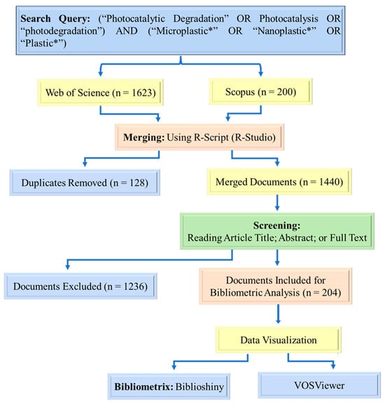 This study utilizes a bibliometric approach to examine global research trends in the photocatalytic degradation of microplastics. By analyzing data from leading scientific databases such as Web of Science and Scopus, we aim to provide a comprehensive overview of the current research landscape, highlighting influential studies, key researchers, and dominant research areas [31]. The Web of Science Core Collection (WoS) and Scopus are leading multidisciplinary databases providing extensive bibliographic information across various research domains. WoS has over 1.9 billion cited references and 85.7 million scholarly records spanning 254 disciplines. At the same time, Scopus offers access to 87 million documents, 1.8 billion citations, and data from 94 thousand affiliations and 7.5 thousand publishers. Independently utilizing WoS and Scopus databases can lead to redundancy and complexity due to overlapping content, making it necessary to eliminate duplicates. It is recommended that metadata be unified for efficient bibliometric research, as each database has unique features [32,33]. Merging both datasets provides comprehensive time coverage, includes new literature, and enhances the accuracy of measuring authors’ impact, thereby improving the analysis of evolutionary citations [19]. User-friendly methods are available—using R packages and Excel—for merging WoS and Scopus datasets while maintaining data integrity [33,34].