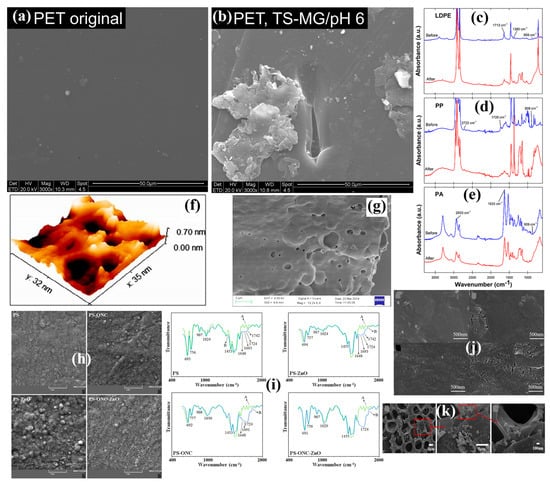 SEM micrographs of PET MPs (a) before and (b) after photocatalytic degradation for 120 h [7]; (c–e) FTIR spectra of LDPE, PP, and PA before and after being exposed to a photo-Fenton catalytic process using 0.5CuO/BiVO4@300 °C for 14 days [8]; (f) AFM and (g) SEM images of PS under BiOCl nanodisk after 90 h visible light irradiation [51]; (h) SEM images and (i) FTIR spectra of PS before and after photodegradation [55]; (j) SEM images of pristine MPs and photodegraded MPs after 20 days of treatment with and without the presence of soil [56]; (k) SEM measurement of Nano-G/TiO2/PVC composite film after exposure to light for 30 h [58].
