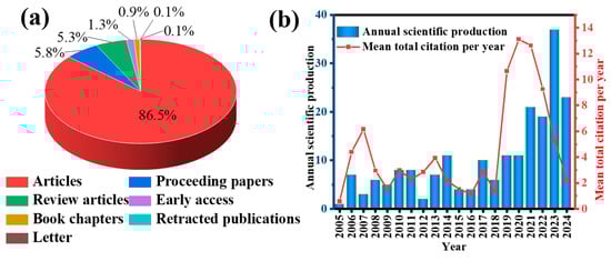 In this study, 1823 records related to microplastic research were retrieved. In the beginning, the statistical data of the studies were sorted and analyzed to draw preliminary conclusions on research trends. The documents were classified into seven distinct categories (Figure 3a), with the largest share being original research articles, accounting for 86.5% of all publications. Review articles and proceeding papers accounted for 5.3% and 5.8%, respectively. Early access (1.3%), book chapters (0.9%), editorial letters (0.1%), and retracted publications (0.1%) were among the less significant categories. The predominance of original research articles is a key indicator of growth and evolution within microplastic research. Therefore, the analysis focused primarily on original research articles on the photocatalytic degradation of nano/microplastics to better capture trends, advancements, and knowledge gaps in the field. This focus enables a detailed evaluation of the core literature shaping the direction of microplastic research.
