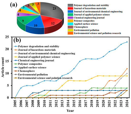 (a) Leading journal sources and (b) production trends in photocatalytic degradation of nano/microplastics research.