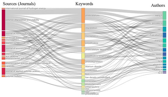 The three-panel plot in Figure 5, also known as the tripartite Sankey Diagram, provides a comprehensive visualization of the relationships among authors, authors’ keywords, and journals (sources) in the photocatalytic degradation of the microplastics research field. The three-panel visualization illustrates the interconnections among research keywords, influential authors, and key publication sources in this research field. The keywords panel shows the core concepts being studied, such as photocatalysis, degradation, photodegradation, polyethylene terephthalates, polyethylene, microplastics, and polystyrene. The density and interconnections between these keywords suggest they are closely related and central to the research. The author’s panel identifies the key researchers contributing to this work. Prominent authors such as Wang H, Cedillo-González E, Zan I, and Chakrabarti S emerge as key contributors, reflecting their impactful publications and significant collaborative efforts in the field. The sources (journals) field reveals the top publication outlets for this research, including the Journal of Hazardous Materials, Journal of Applied Polymer Science, and Polymer Degradation and Stability. The thick connections between specific journals suggest they are frequently cited together, reflecting their topical relevance.