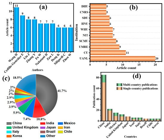 Figure 6b presents the top institutions involved in this field, with Universidad Autonoma de Nuevo Leon (UANL, Mexico) contributing the highest number of publications (20), followed by University of Calcutta (CU, India) and Universita Di Modena E Reggio Emilia (UNIMORE, Italy). This concentration of publications in specific institutions suggests that these centers have dedicated resources and facilities for advancing environmental remediation techniques. Institutional leadership like this is important because it fosters collaboration with industry and governmental organizations, potentially facilitating the translation of research findings into practical technologies for wastewater treatment. These high-output institutions can drive technological advances and influence global research priorities in addressing plastic pollution [62].