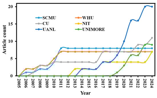 The publication output from various academic affiliations over time is illustrated in Figure 7. From the figure, a notable increase in research activity since around 2015 is observed. Universidad Autónoma de Nuevo León (UANL, Mexico) demonstrates the most significant growth, particularly after 2018, which suggests an intensified focus on this research area in recent years. In contrast, the University of Calcutta (CU, India) and Wuhan University (WHU, China) show steady outputs, reflecting consistent contributions over time but with less rapid recent growth than Universidad Autónoma de Nuevo León. South Central Minzu University (SCMU, China) began contributing earlier and maintained a relatively stable publication rate, indicating an early and sustained interest.
