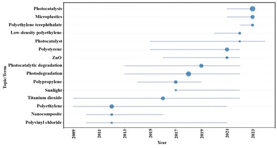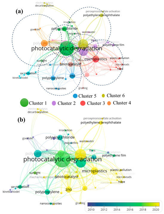 However, despite the growing body of research on photocatalytic degradation of microplastics, there is a need for a clearer understanding of the global research landscape in this field. Bibliometric analysis is essential for understanding a research field, as it effectively maps the intellectual structure and identifies trends within that domain. Quantitatively analyzing academic publications allows researchers to identify patterns, key contributors, influential papers, and emerging trends. Bibliometrics can uncover hidden connections within a field, providing insights into how research evolves and highlighting areas of high activity or potential gaps in knowledge. This approach is particularly valuable in fast-growing research areas like photocatalytic degradation of microplastics, where keeping track of the vast and diverse literature can be challenging [18,19].
