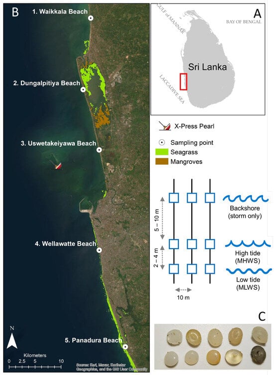 This study presents data on the distribution and accumulation of microplastic pellets and other plastic debris greater than 1 mm diameter along the beaches of Sri Lanka’s western coastline one year after the sinking of X-Press Pearl in May 2021. This event has been recognized as one of the worst man-made environmental disasters in the country’s history []. Its ongoing effects pose substantial risk to the environmental values and diversity of marine life (fauna and flora) within the region [] and may affect coastal communities that rely on marine resources for their livelihoods (e.g., through fishing). Indeed, recent studies have shown that microplastics are increasingly being found in commercially important fish and prawns within the Negombo lagoon, the entrance to which is near the site of the disaster [,]. Quantifying the degree to which pellets are still present within beach sediments and other ecosystems, such as lagoons and estuaries (where they can be trapped by aquatic vegetation, like mangrove forests and seagrass), is vital to understand the potential long-term ecological and societal impacts.