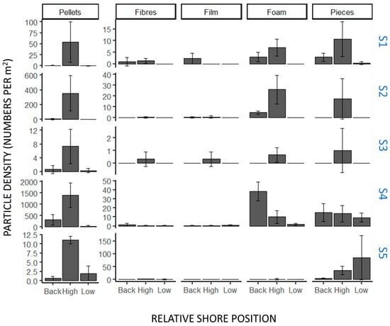 Comparison of the surface density of different types of microplastic particles sampled from beach sediments at three different tidal heights and five sites along the west coast of Sri Lanka. Codes on the RHS correspond to sites: S1—Waikkala Beach, S2—Dungalpitiya Beach, S3—Uswetakeiyawa Beach, S4—Wellawatte Beach, and S5—Panadura Beach.
