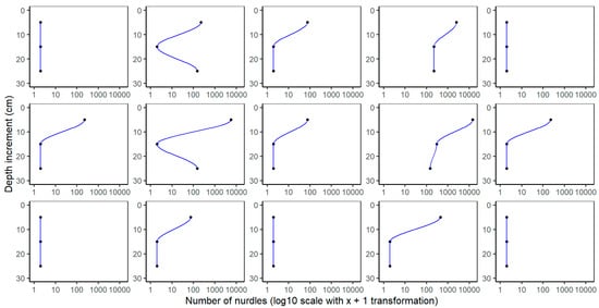 To compare the abundance (number density) of pellets found in our study with previous estimates, we used the pellet pollution index (PPI) [], which is given by the following equation: PPI = (n/a) × p, where ‘n’ is the number of pellets found, ‘a’ is the area of the quadrat in m2, and ‘p’ is the correction coefficient value 0.02. The results are then classified within different ranges of pollution level: very low (0.0 < PPI ≤ 0.5); low (0.5 < PPI ≤ 1.0); moderate (1.0 < PPI ≤ 2.0); high (2.0 < PPI ≤ 3.0); and very high (PPI > 3.0) []. These results can then be used to compare the severity of other pollution events using this same metric (e.g., []) or similar values calculated per kg of sediment (e.g., []). While the approach has the advantages of allowing quick comparisons that can aid in cleanup operations, the results can vary depending on the sampling scale, scope and inherent variability, and can introduce inconsistencies. Nevertheless, we provide this information to advocate for greater transparency and consistency in future applications.