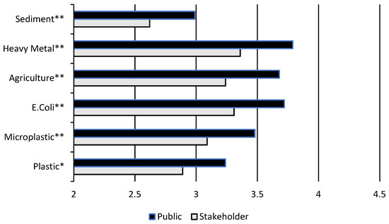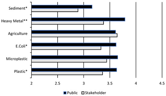 Significant differences emerged between the public and stakeholders regarding perceptions of environmental harm associated with pollutants (Figure 1). Using Mann–Whitney U tests, the public perceived plastic (z = –1.72, p = 0.086), E. coli (z = –1.68, p = 0.092), sediment (z = –1.66, p = 0.098), and metals (z = –2.43, p = 0.015) as significantly more harmful to the environment than stakeholders, all at at least the 90% confidence level. However, no significant differences were observed between the groups for perceptions of environmental harm related to microplastics or agricultural runoff.