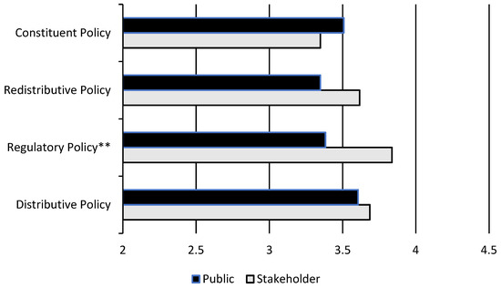 When examining differences in preferences for public policy solutions, the results (Figure 3) reveal significant differences between stakeholders and the public for only one policy solution type. Using the Mann–Whitney U test, stakeholders showed significantly stronger preferences for regulatory policy (z = −2.73, p = 0.006) compared to the public. No statistically significant differences were found for distributive policy, redistributive policy, or constituent policy. Furthermore, when evaluating overall policy support—calculated as respondents’ average support across all policy types—no significant difference emerged between public and stakeholder groups (z = –1.06, p = 0.287). This suggests that despite some variation in the types of policies preferred, both groups were similarly supportive of policy action to address pollution more broadly.