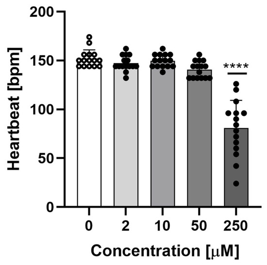 As shown in Figure 3, sodium azide caused a statistically significant decrease in heart rate at a concentration of 250 μM. In addition, the heart rate at this concentration was highly diverse, which was due to the fact that this concentration was very close to the LC50, and some larvae were near death.