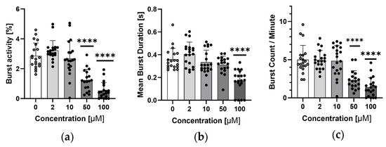 Tail coiling assay results for 24 hpf Danio rerio embryos. (a) Embryo activity as a percentage of time when they were moving at different concentrations of sodium azide, (b) mean burst duration of single embryo movement at different concentrations of sodium azide and (c) number of single embryo movements per minute at different concentrations of sodium azide. Data are shown as mean ± SD; n = 18–20; **** p < 0.0001; one-way ANOVA; post-hoc Dunnett test.