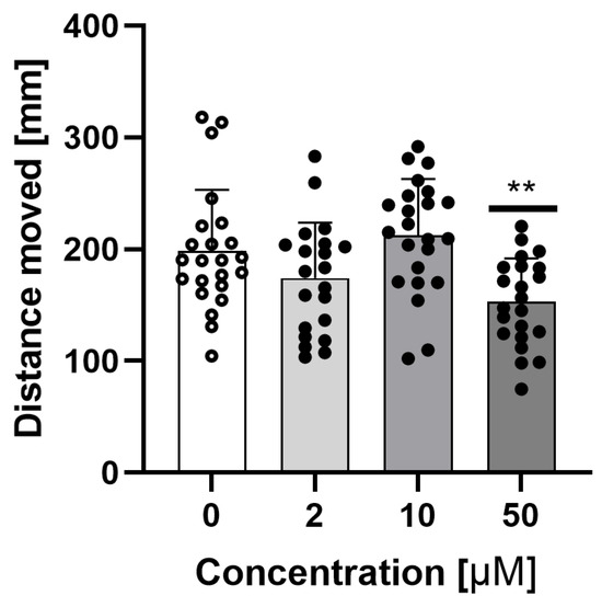 Total distance moved by embryo at 96 hpf in light–dark preference test during dark periods for different, non–lethal sodium azide concentrations. Data are shown as mean ± SD; n = 21–23; ** p < 0.01; one-way ANOVA, post-hoc Dunnett test.
