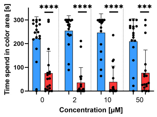 Colour–preference test for Danio rerio at 120 hpf. Comparison between time spent in blue and red areas for different non–lethal sodium azide concentrations. Data are shown as mean ± SD; n = 18; t-test Wilcoxon test, *** p < 0.001, **** p < 0.0001.