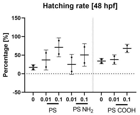 Hatching rate at 48 hpf for larvae exposed to different concentrations [mg/mL] of fluorescent NanoPS. Data are shown as mean ± SD; n = 2 for all.