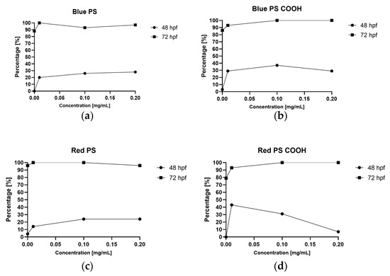 Hatching rate at 48 and 72 hpf for larvae exposed to different concentrations of (a) blue PS, (b) blue PS with carboxyl groups, (c) red PS, and (d) red PS with carboxyl groups.