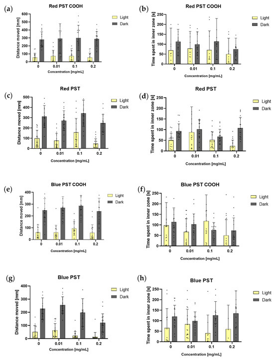 In the light–dark preference test for fluorescent nanoPS, there were no differences between treatments and the negative control in the total distance moved by larvae during the dark periods (Figure S11). Figure 10 shows the results of the light-dark preference test for colour–dyed nanoPS.
