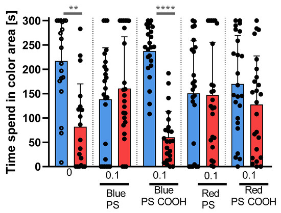 Colour–preference test for Danio rerio. Comparison between time spent in blue and red areas for different types of colour–dyed nanoPS. Data are shown as mean ± SD; n = 12; Wilcoxon test, ** p < 0.01, **** p < 0.0001.