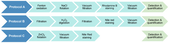 In this study, three different protocols are assessed. To facilitate direct comparison between protocols, all filtration steps in this study were carried out using glass fibre filters with a pore size of 1.2 µm and the analysis was performed in triplicate. In addition, blank filters were prepared to avoid interference from staining or MPs’ release from filters themselves, and no false positives coming from the filters were found. In Figure 1, the three protocols are presented: