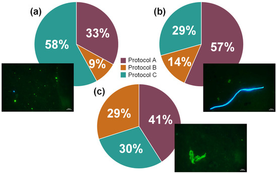 The results indicate a higher presence of fragments across all three protocols evaluated. These fragments are mainly distributed within the smaller size ranges (<100 µm), with protocol C reporting the highest number of MPs, mainly in those with the smaller sizes (58%), followed by protocol A (33%) and, finally, protocol B (9%). However, this trend changes when considering fibres (in all the size ranges studied). In this case, protocol A demonstrates higher efficiency in the identification of this morphology (57%). A similar pattern is observed for films, where protocol A also achieves the highest quantification among the three protocols (41%) (as can be seen in Figure 2).