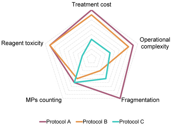 Based on the quantitative findings from MP quantification, statistical significance, and economic assessment, a multicriteria evaluation was conducted to compare the overall feasibility of each protocol.