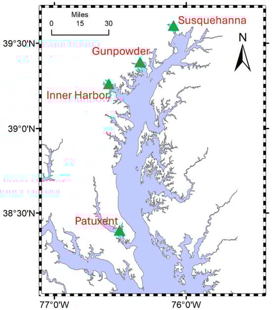 Surface water samples were collected monthly from four locations in the Chesapeake Bay between July 2023 and October 2023 (Figure 1). At each site, a 10 L surface water sample was collected. The selected locations along the Chesapeake Bay in Maryland included: Havre De Grace (39.55486 N 76.09145 W), Dundee Creek Marina (39.35166 N 76.35879 W), Baltimore’s Inner Harbor (39.28160 N 76.61080 W), and the Patuxent Environmental and Aquatic Research Laboratory (PEARL) (38.39428 N 76.50382 W). The four sampling sites represent diverse environmental settings within the Chesapeake Bay watershed. Havre de Grace, Maryland, an urban area at the Susquehanna River sub–estuary, is influenced by the largest watershed in the Chesapeake Bay, which contributes 51% of its freshwater inflow and spans urban, industrial, and agricultural land uses [24]. Dundee Creek Marina, located in a state park at the Gunpowder River sub–estuary in Middle River, Maryland, is downstream of a landfill and sewage treatment plant, with surrounding urban, suburban, and rural land uses. Baltimore’s Inner Harbor, a major seaport at the mouth of the Jones Falls in Baltimore, Maryland, is characterized by dense urban development and mixed land uses. The fourth site, the PEARL, lies in Jefferson Patterson State Park within the Patuxent River sub–estuary in Saint Leonard, Maryland, where the watershed supports a population of approximately 800,000 people and consists of forests, croplands, grasslands, and impervious surfaces [25].