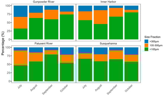 Microplastic size fractions were analyzed across four locations (Susquehanna River, Gunpowder River, Baltimore’s Inner Harbor, and Patuxent River) in the Chesapeake Bay from July 2023 to October 2023 (Figure 3). Microplastics were divided into three size fractions: >300 µm, 100–300 µm, and <100 µm, respectively, with abundances and percentage distributions reported. The size fraction analysis revealed a consistent dominance of smaller microplastic particles (<100 µm) across all sampling locations and months, constituting 45.7–80.2% of total abundance. Spatial heterogeneity was evident: the Gunpowder River displayed relatively balanced distributions in July (32.3–34.6% across size classes), contrasting with a shift toward larger particles in the Patuxent River in October (>300 µm: 21.7%, vs. 8.3% in September). These patterns highlight the ubiquity of small microplastics and location–specific seasonal dynamics, potentially reflecting differential pollution sources, hydrodynamic conditions, or degradation processes across the Chesapeake Bay watershed.