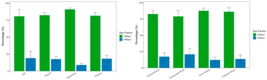 Overall, microplastic size fractions in the Chesapeake Bay were overwhelmingly dominated by particles < 300 µm (Figure 4) across all locations and seasons, consistently comprising 76% (±8% SD) of total abundance. This fraction, which cannot be sampled by conventional manta net, exhibited minimal spatial variability, with proportions ranging from 67% (Gunpowder River in July) to 91.74% (Patuxent River in September), and temporal stability, maintaining >70% prevalence even during peaks in larger particle inputs (e.g., Susquehanna River’s >300 µm fraction reached 21.9% in October). While minor seasonal fluctuations occurred (e.g., Gunpowder River’s > 300 µm fraction declined from 33% in July to 17% in October), the <300 µm fraction remained the predominant size class, underscoring ubiquity irrespective of localized hydrodynamic or anthropogenic drivers.