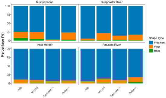 All collected microplastics were grouped under one of the three categories of shape: fragment, fiber, and bead. Randomly chosen microplastics, between 90 and 100, per silver membrane, were analyzed to calculate the proportions of the different shapes captured during sampling. The microplastic shape analysis revealed pronounced dominance of fragments across all sampling locations and months, constituting 74.1–97.0% of total particles (Figure 5). This fragment predominance was particularly evident in September, where all locations exhibited >85% fragment composition, peaking at 97.0% in September for Susquehanna River. Fibers represented a secondary component (3.0–21.0%), with spatial variability most pronounced in the Gunpowder River, where fiber percentages fluctuated seasonally (5.3% in July to 20.9% in August). Beads were largely negligible (<5.0%) except for isolated instances, such as the Patuxent River (4.2% in October).