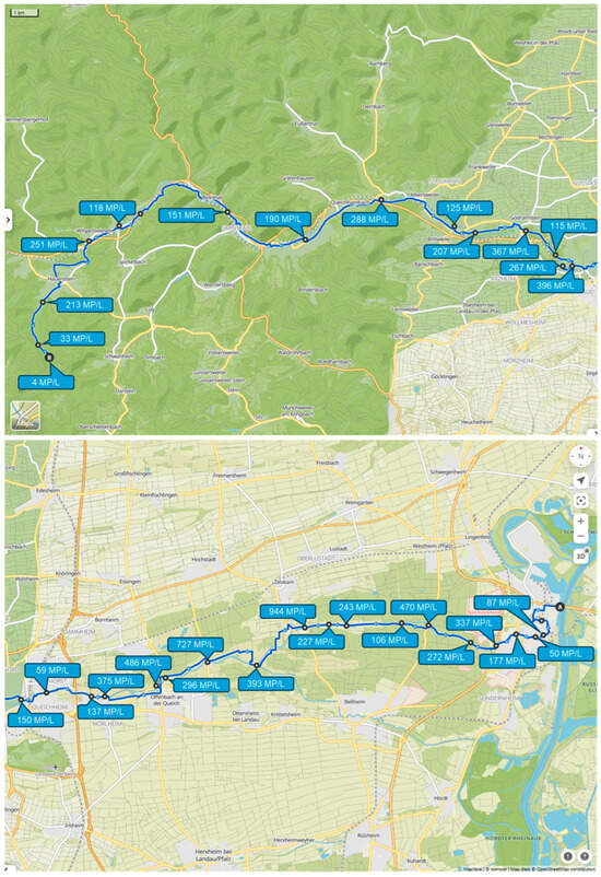 - Landesamt für Umwelt Rheinland-Pfalz. Steckbriefe der Oberflächenwasserkörper. Available online: https://wasserportal.rlp-umwelt.de/auskunftssysteme/wasserkoerper-steckbriefe-wrrl (accessed on 20 July 2025).