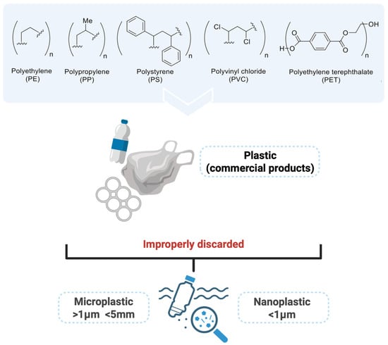 The term “microplastics” (MPs) was first proposed by Thompson et al. in 2004 and refers to plastic particles with a size >1 μm and <5 mm, where nanoplastics (NPs), in turn, are defined by the European Food Safety Authority (EFSA) as <1 μm particles [12]. The primary source of MPs and NPs in the environment is the improperly discarded plastic devices, transported to rivers and oceans, and then fragmented mechanically or by solar irradiation in nature (Figure 1) [13].