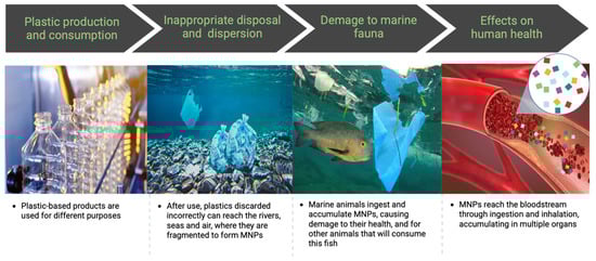 There are two main routes for particles of MNPs to reach the environment: (i) particles formed during the production of plastics following direct human activity, and (ii) products of the decomposition of plastics or larger plastic fragments incorrectly discarded after usage [27]. These particles cause enormous economic losses in various sectors, including maritime transportation and fishing activities. Five trillion particles of MPs float in rivers and oceans or are deposited on beaches. Due to their size, they enter the food chain of the human beings that live in these habitats, but more than this, they affect all people who consume fish or seafood [28,29]. Surprisingly, the skin-exfoliating polymeric microspheres, an ingredient found in cosmetic products such as shampoos, toothpaste, soaps, and creams, are the new source of environmental contamination by MNPs.