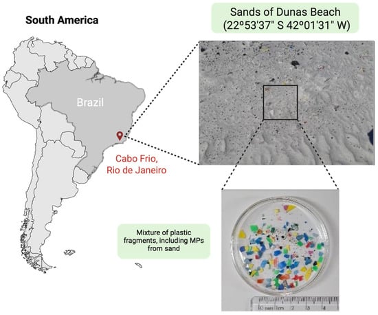Plastic fragments, including MPs, collected from the sands at Praia das Dunas in Cabo Frio, RJ, Brazil (22°53′37″ S 42°01′31″ W). Created in https://BioRender.com.
