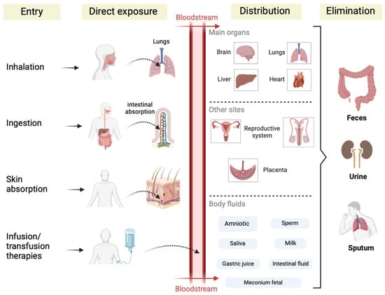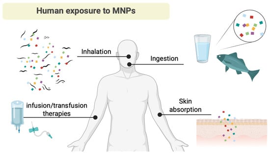 Humans can be exposed to MPs through the inhalation of particles present in the air (especially in metropolitan cities), ingestion of contaminated water and or food, or through absorption by the skin, and also, less frequently, but not more critically, by tubing of transfusion therapies (Figure 4) [37,38,39,40]. After entering the human body, MPs and NPs reach the bloodstream, are distributed, and can accumulate in various tissues and organs [41]. MPs and NPs were detected in the oral, anal, and/or uterine/vaginal cavities, which are directly accessible because they are in contact with the external environment [42]. However, NPs can be translocated to any tissue or cell since their size allows them to be diffused into the lipid environment of both plasmatic and intracellular membranes.